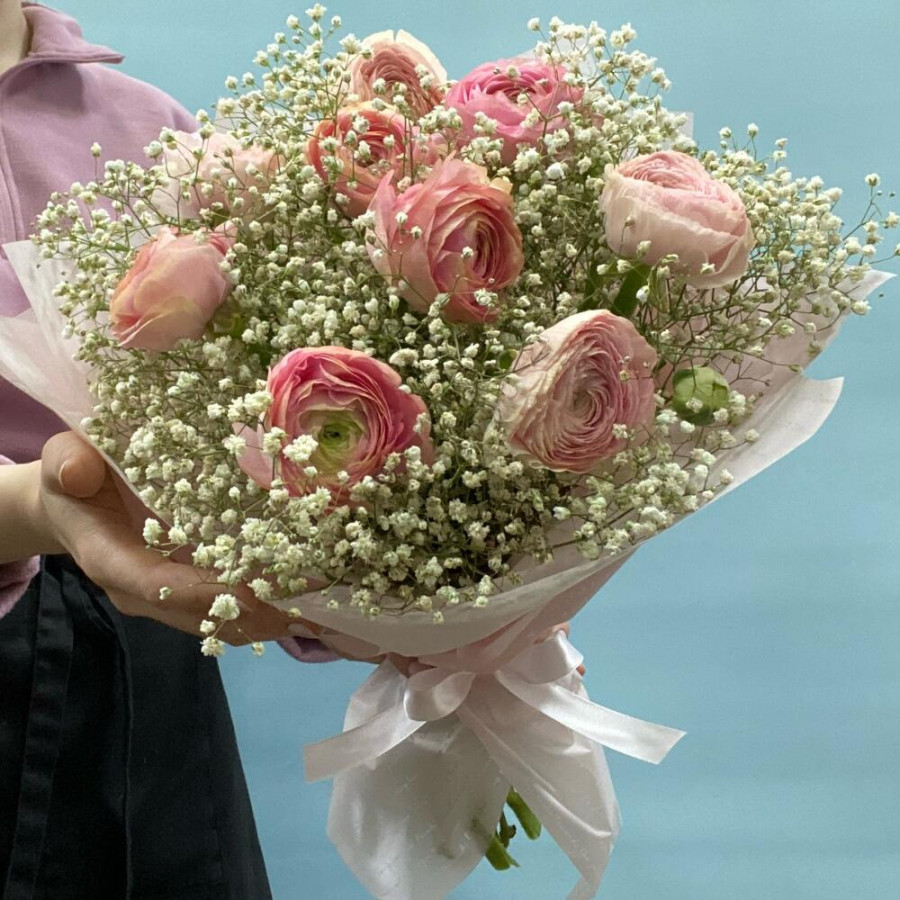 На фото букет из розовых ранункулюсов с белой гипсофилой. В составе: ранункулюс 9 шт, гипсофила 9 шт, дизайнерская упаковка 1 шт, атласная лента 1 шт, . Все цветы свежие и ароматные, букет красиво оформлен и отлично подходит для подарка. Доступна доставка цветов или самовывоз.