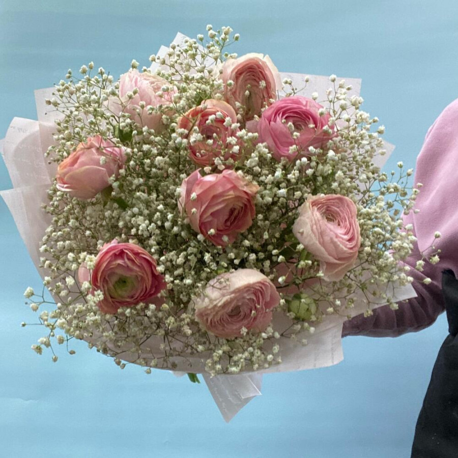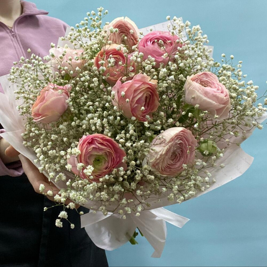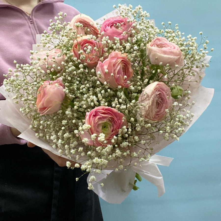 Букет из розовых ранункулюсов с белой гипсофилой